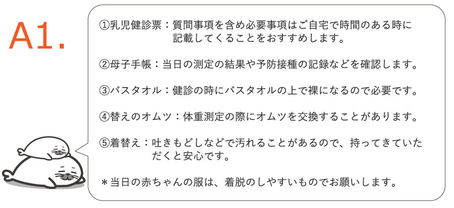 母子手帳、乳幼児健康診査受診表(各月齢用)、マイナ保険証を必ずお持ちください。